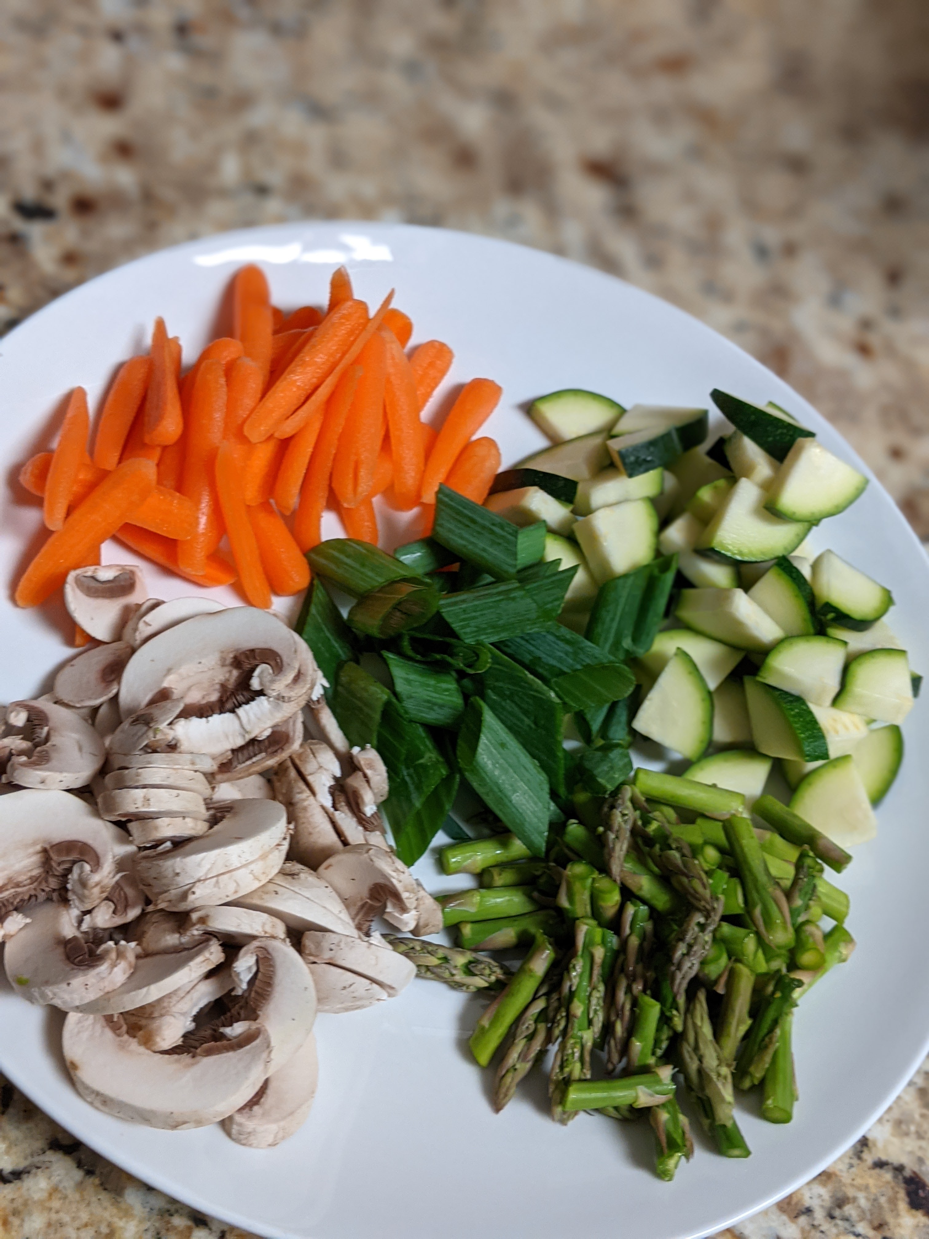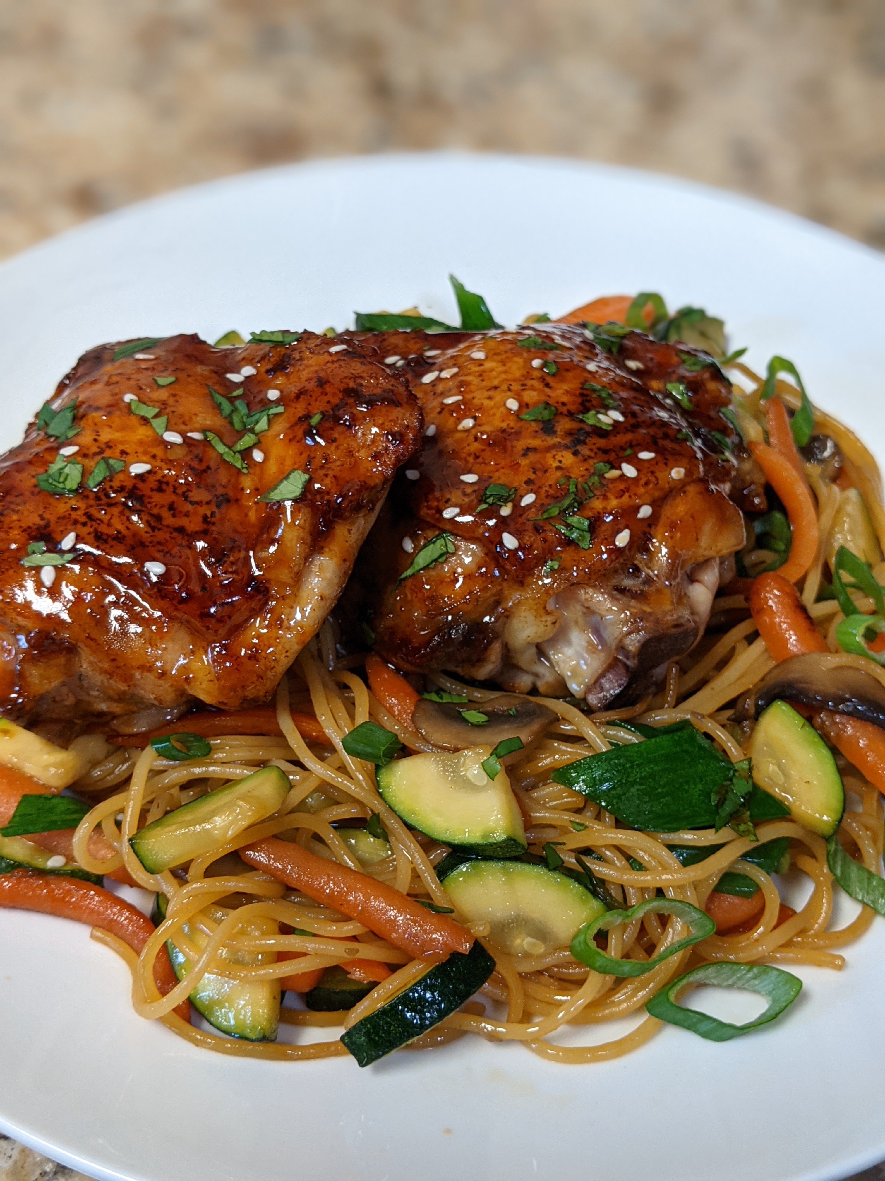 I used diced zucchini, white mushrooms, carrots, asparagus and scallions. Add in cooked pasta and sticky sauce and toss. Top with additional scallions and toasted sesame seeds if desired. Enjoy!