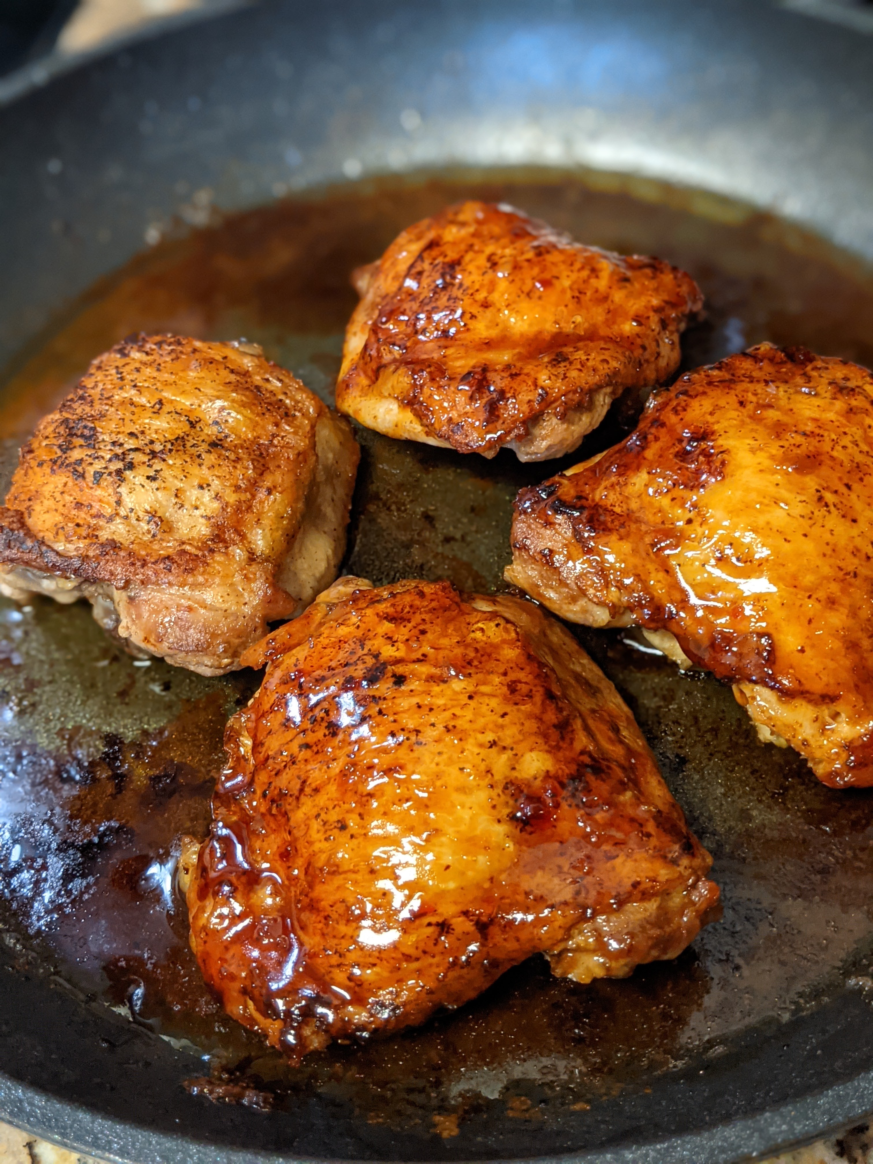 Preheat oven to 375°. Season your chicken thighs with salt and pepper and place skin side down in an oven proof skillet. Cook until golden brown and flip. Baste the skin side of the chicken thighs with the sticky glaze and place in the over until the internal temperature reaches 165. Let rest.